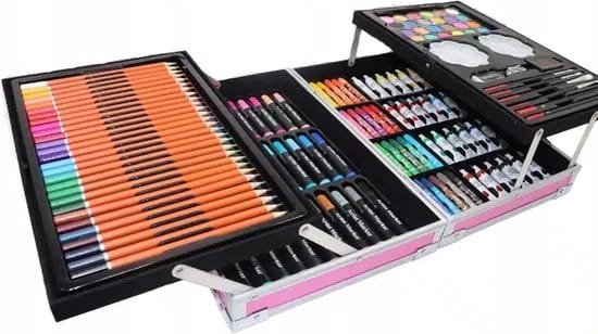 De artistieke set van 145 elementen zal de verbeeldingskracht en creatieve vermogens van uw kind aanwakkeren . De magische koffer bevat alles wat je nodig hebt om te spelen : kleurpotloden, viltstiften, pastelkleuren, verf en andere voorwerpen die handig zijn voor artistieke creatie: liniaal, gum, penseel, enz.